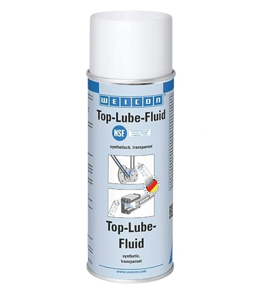 Weicon Top-Lub Fluid, özellikle hassas mekanik parçalar için geliştirilmiş yüksek yapışkanlı, sentetik yağlayıcı spreydir. NSF H1 onayı sayesinde gıda, ilaç ve kozmetik sektörlerinde güvenle kullanılabilir. Ürün, dar ve ulaşılması zor alanlarda bile yüksek nüfuz yeteneği ile sürtünme ve aşınmayı minimuma indirir, aynı zamanda suya ve dış etkenlere karşı dayanıklıdır.